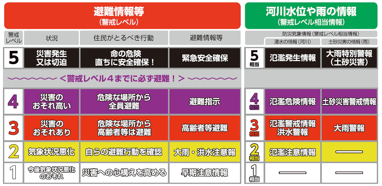 - 警戒レベル3(市が発令):危険な場所から高齢者等は避難!