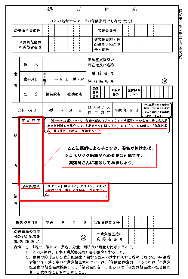 処方せんに、ジェネリック医薬品が記載されていれば、薬局で調剤してもらうことができます。また、処方せんにあるジェネリック医薬品への「変更不可」の欄に医師によるチェックと医師の署名がなければ、薬剤師と相談して、ジェネリック医薬品に切り替えることができます。