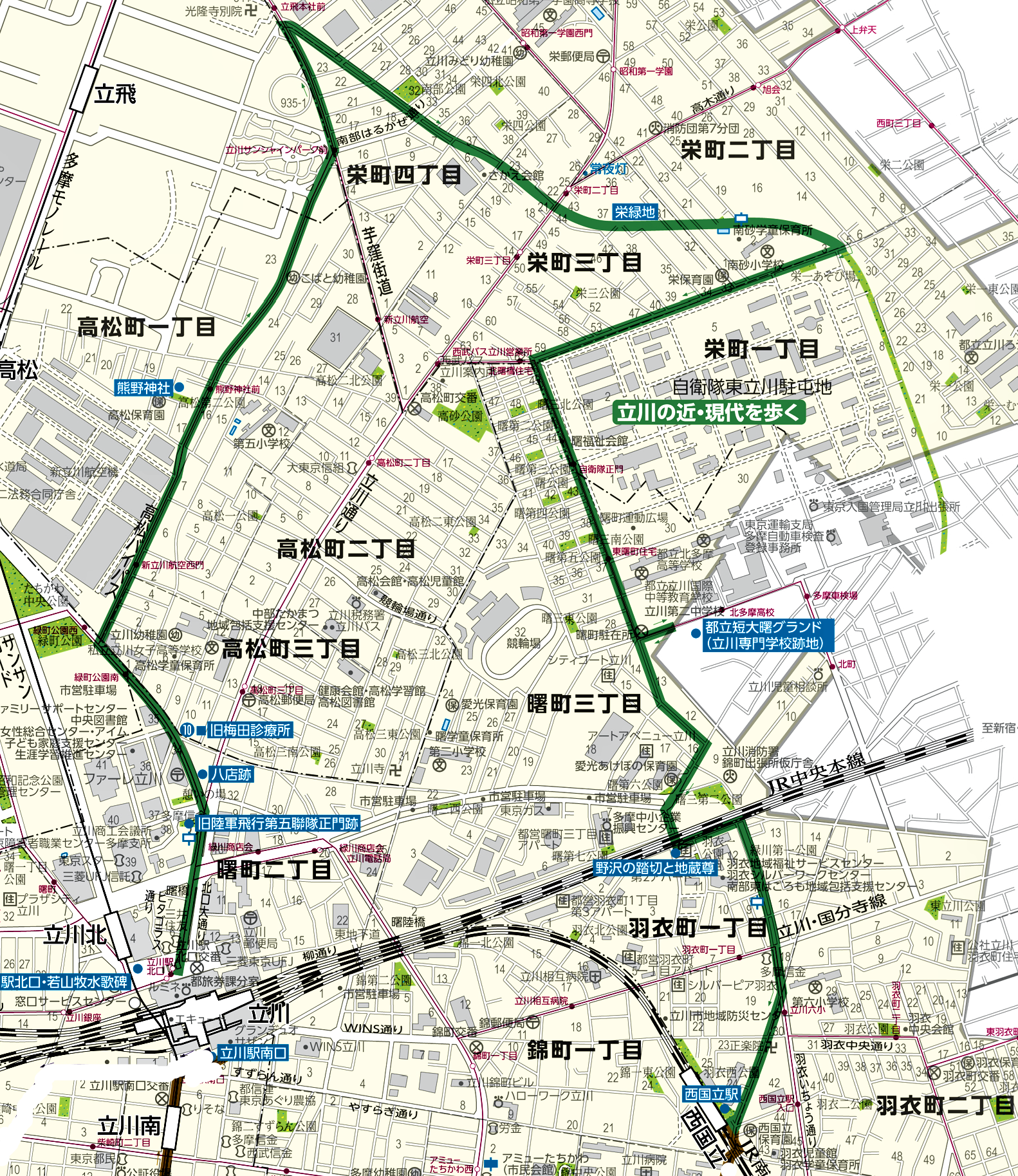 立川駅北口を出発し、市の中心部を歩くコースです。