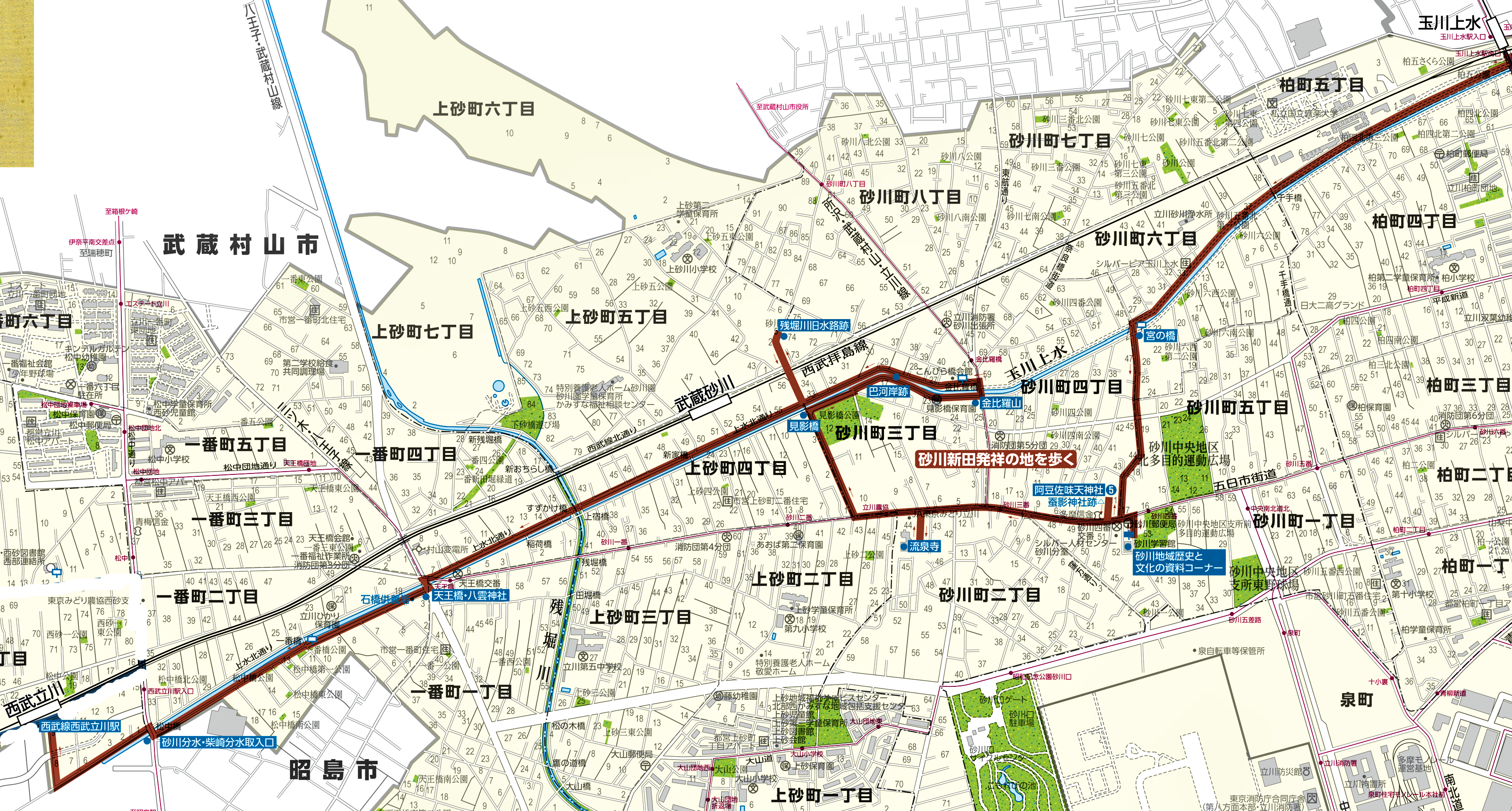 玉川上水駅を出発し、砂川の神社や水路を巡るコースです。