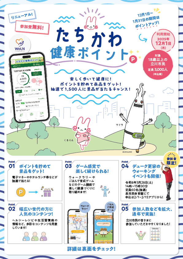 立川市では、気軽に健康づくりに取り組めるように、平成30年度から健康ポイント事業「たちかわ健康ポイント」を毎年活動期間を定めて実施していました。令和7年度からは、参加人数を大幅に増やし、なんと3,000人!そして、一年を通して活動できるようにリニューアルしました。