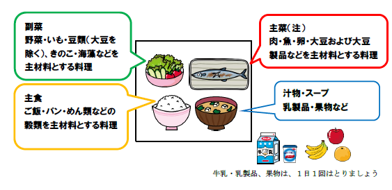 主食・主菜・副菜がそろうと、栄養のバランスがよくなります。果物と乳製品も忘れずに!