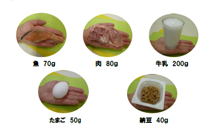 (注)主菜は、たんぱく質を多く含む食品を使った料理です。筋肉を維持するために必要なたんぱく質量は、片手にのるくらいの量を、毎日5種類くらいが目安となります。