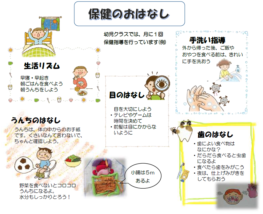 市立保育園には各園に看護師がおり、幼児クラスで月に1回保健指導を行っています。