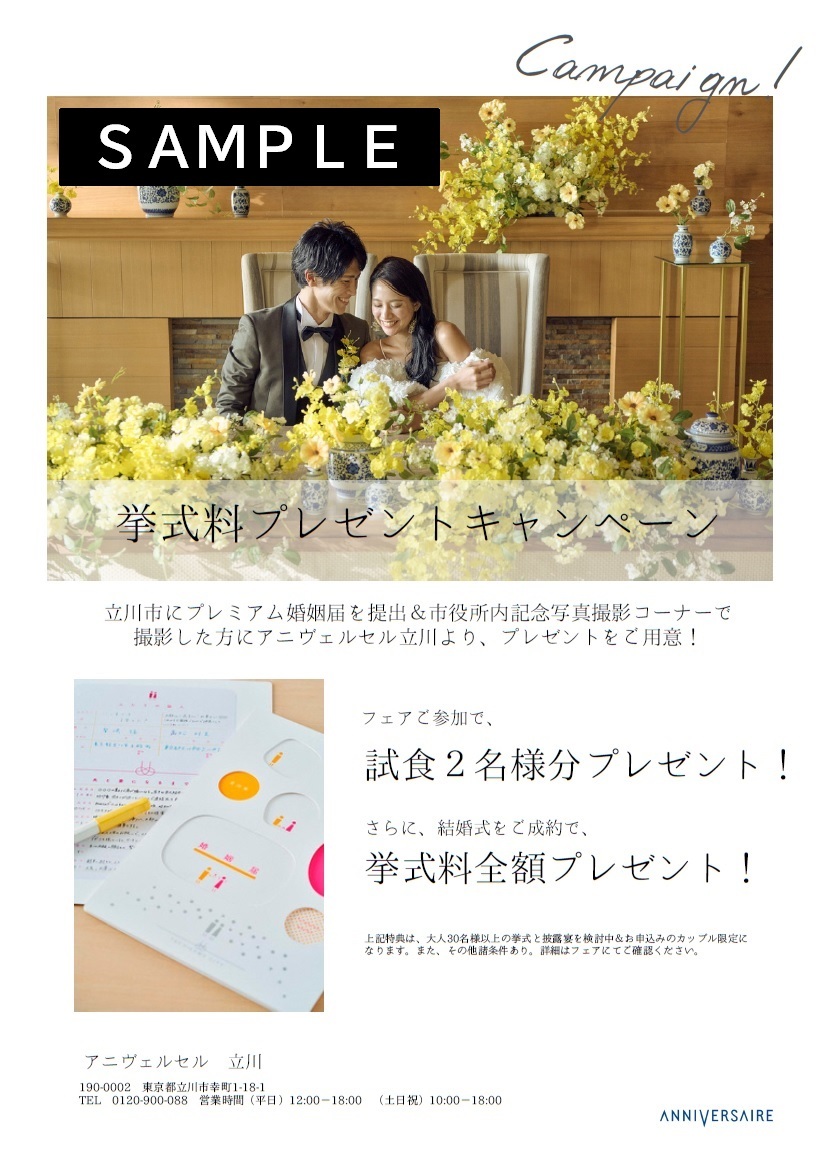 | 3 | 挙式料プレゼントキャンペーン | アニヴェルセル株式会社(アニヴェルセル立川) |