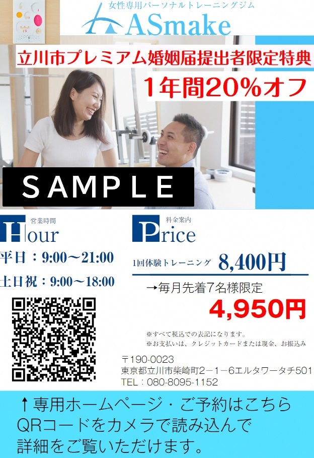 | 2 | 入会後1年間20%オフキャンペーン | 株式会社L.I.B(女性専用パーソナルトレーニングジムASmake) |
