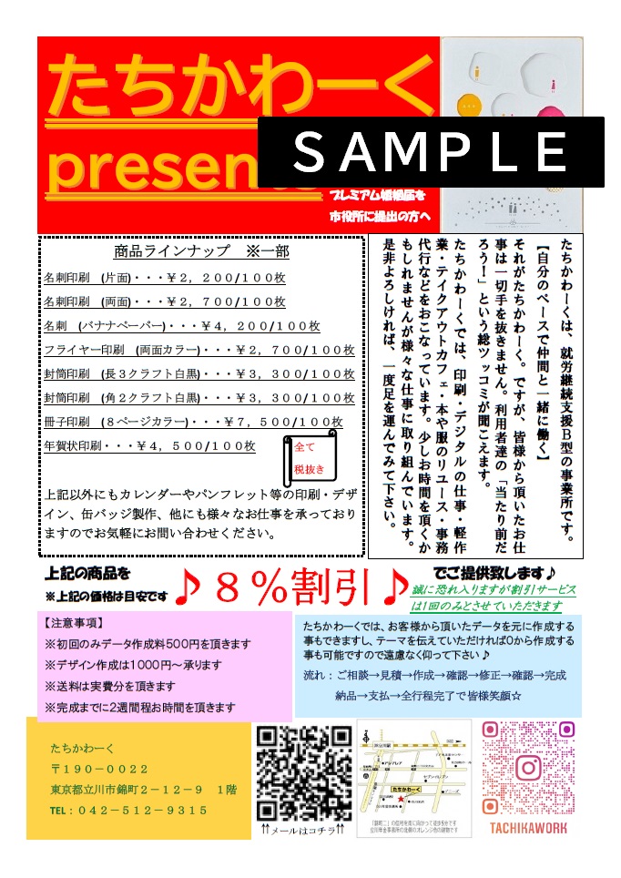 | 1 | 印刷割引サービス | 労働者協同組合ワーカーズコープ・センター事業団(障害者就労継続支援B型事業所たちかわーく) |