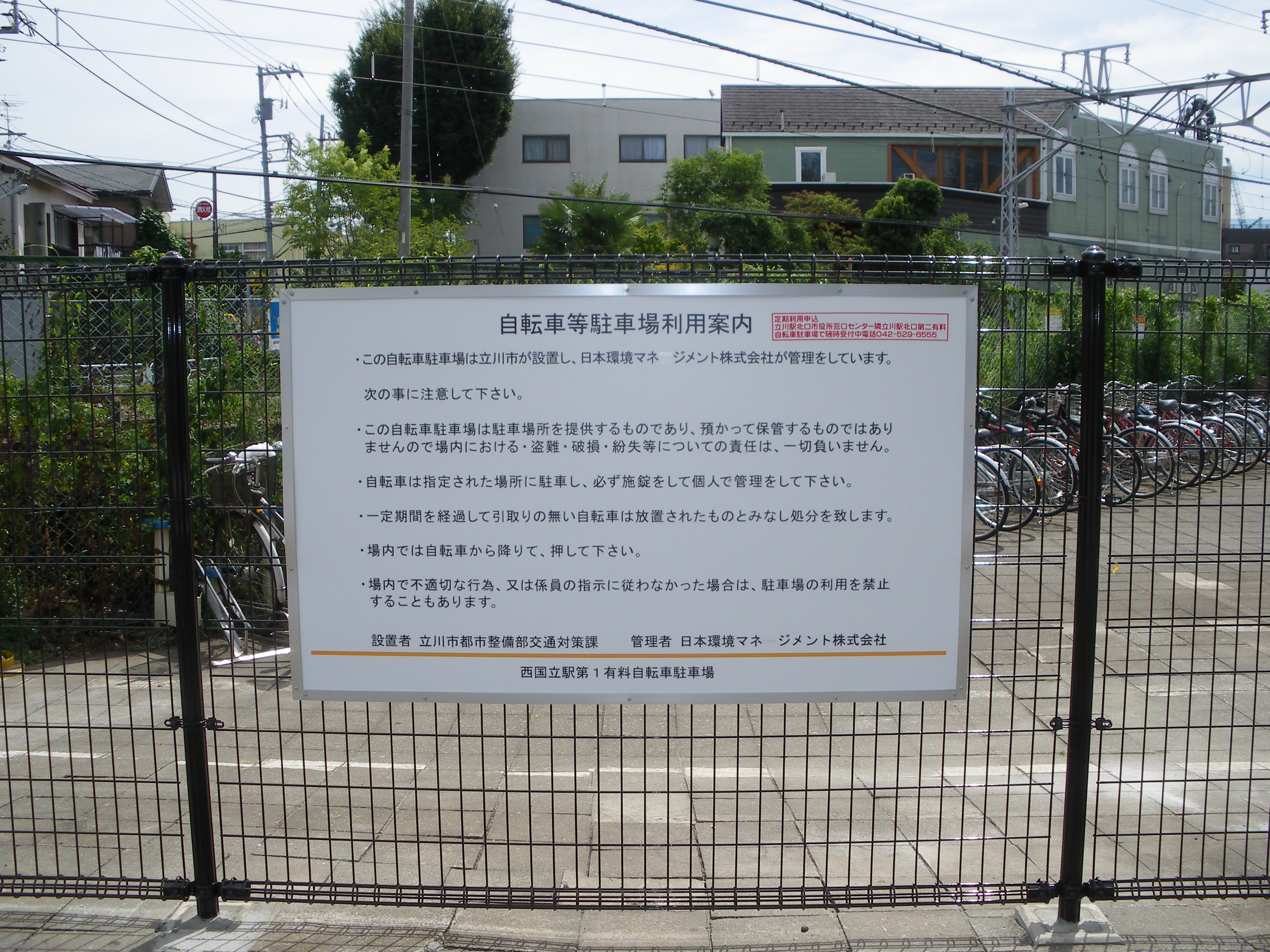 - 利用時間:24時間、連絡先:042-529-6555(【定期利用の申込について】立川駅北口西地区有料自転車駐車場)またはCYCLE PARK立川共同企業体のコールセンター0120-773-840(フリーダイヤル・24時間)