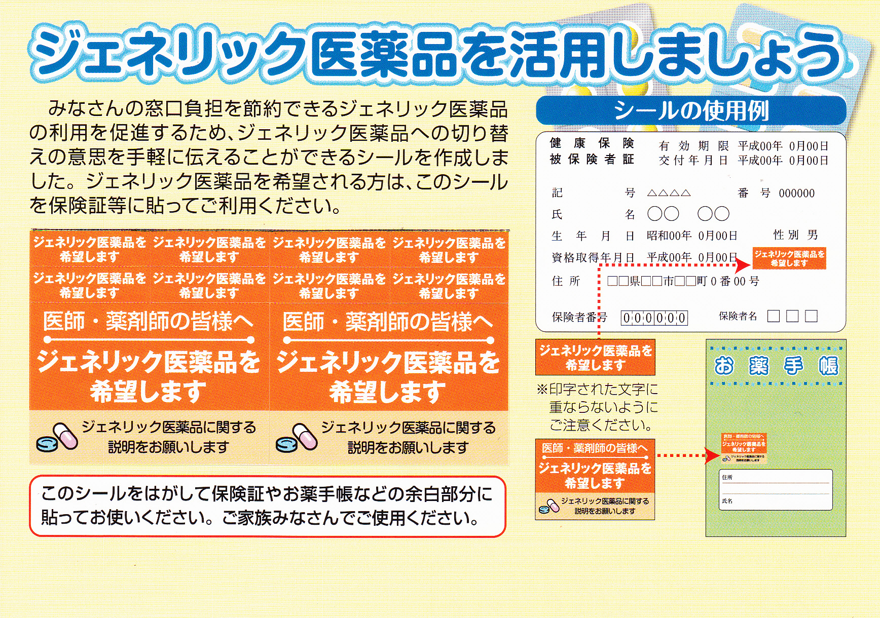 ジェネリック医薬品を希望する被保険者の方が、医師、薬剤師にその希望をより伝えやすくできるように被保険者証やお薬手帳に貼付するなどし、ぜひご活用ください。