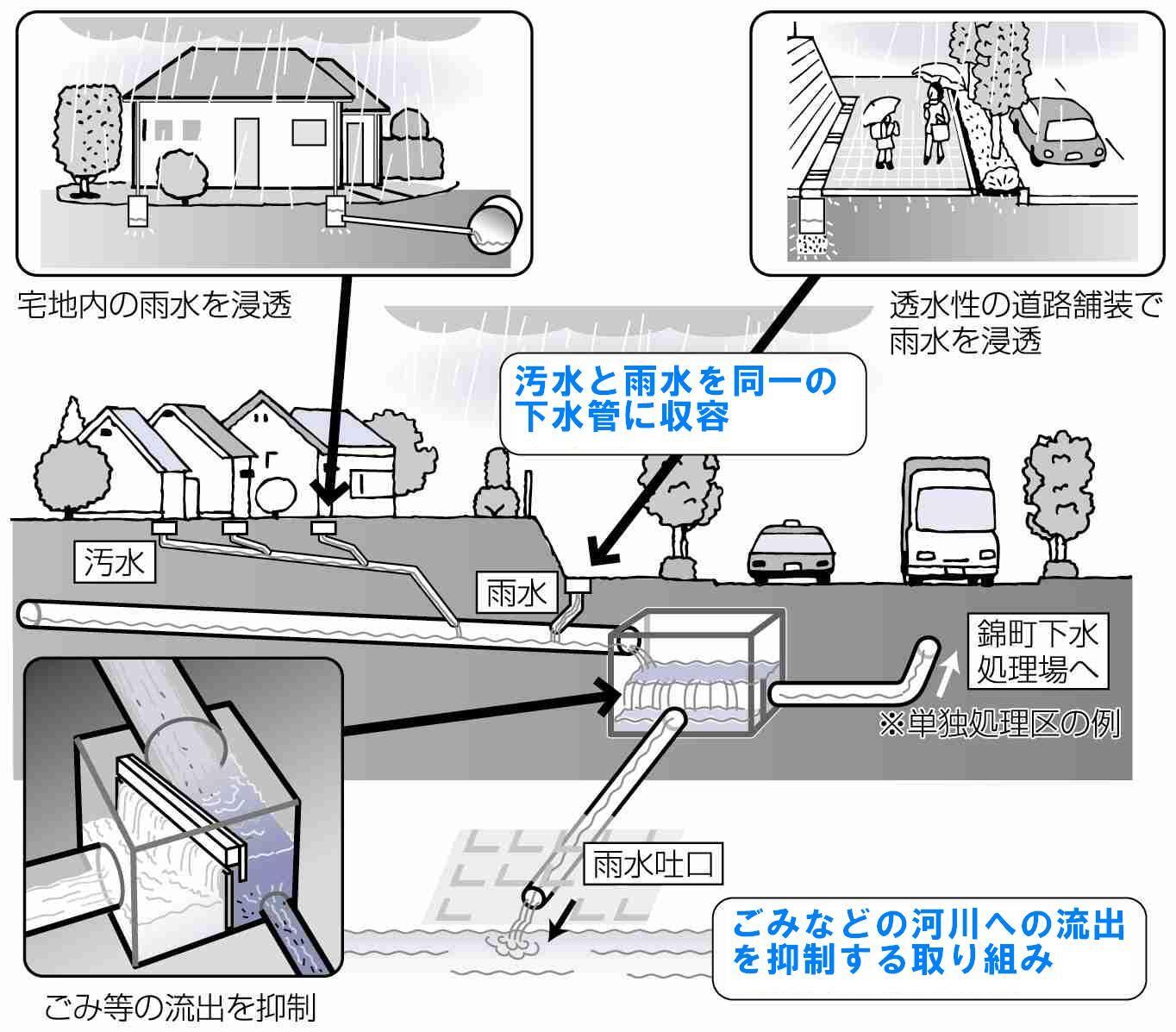 越流水による河川への衛生面や水質面の影響を軽減するため、ごみなどの河川への流出を抑制する取り組みとして、宅地内の雨水を浸透させたり、透水性の道路舗装で雨水を浸透させることによって下水管内の増水を防いだり、雨水吐口の手前でごみ等の流出を抑制する施設を設置することなどがあります。