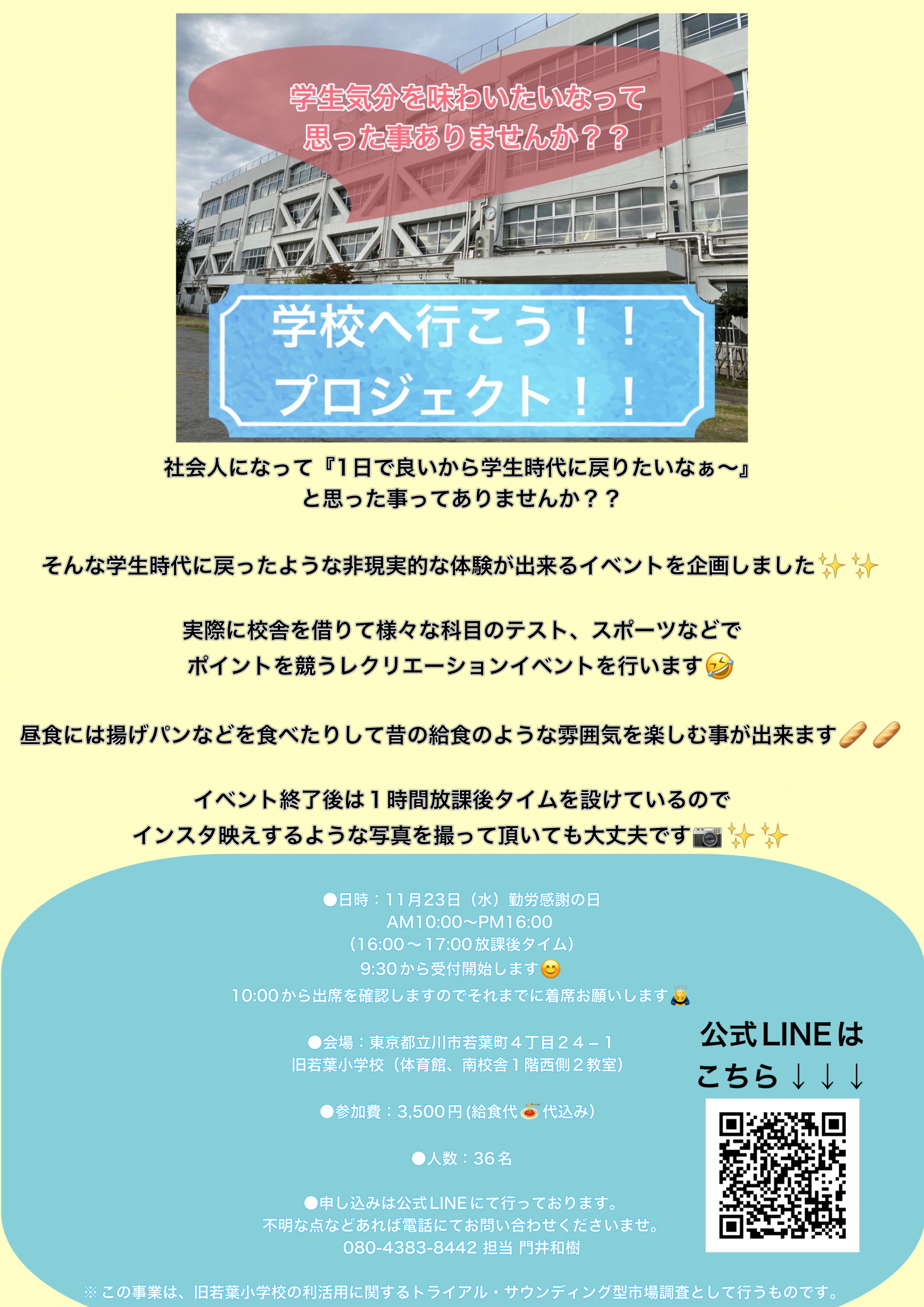 そこで、今後の「若葉町まちづくり方針」策定の参考とする為、若葉町まちづくりワークショップで各班が取りまとめたポスターの範囲内の事業内容に限定し、旧若葉小学校の校舎、体育館、校庭を民間事業者が使用し、試験的に事業を実施する「トライアル・サウンディング型市場調査」を実施します。